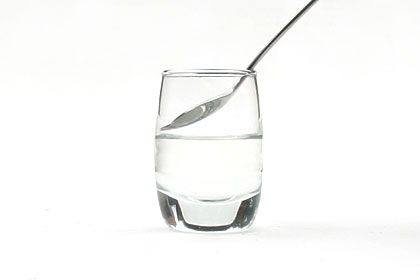 Em seguida, você vai precisar do auxílio de uma colher de bar (bailarina). Coloque-a de forma que sua ponta encoste no canto do copo e ao mesmo tempo na bebida que foi despejada primeiro, como na foto abaixo.