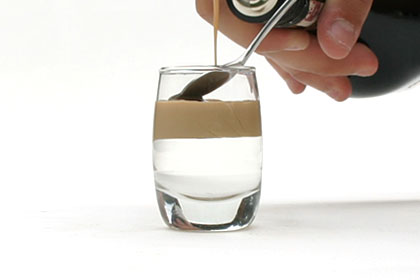 Depois de acertar a posição da colher, despeje a próxima bebida sobre a mesma, bem suavemente.