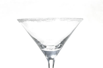 Coloque açúcar em um prato, gire a borda externa da taça sobre ele e, ao mesmo, vá puxando-a delicadamente para trás. Desse modo, o açúcar gruda apenas do lado de fora da borda.